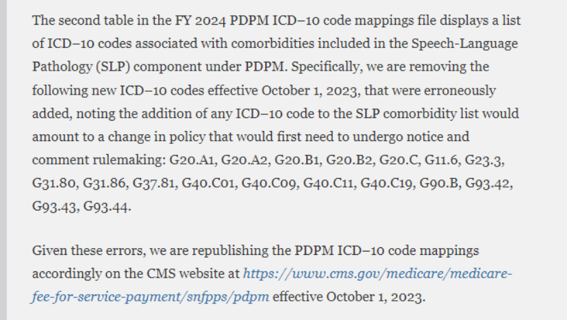 It was previously mentioned that the new Parkinson’s Disease, with or without dyskinesia, and the Parkinsonism ICD-10-CM codes would be classified under the PDPM Speech Language Pathology (SLP) Comorbidity. However, as of the revision posted on September 19, 2023, these diagnoses were not included in the SLP Comorbidity for FY 2024 PDPM ICD-10 Mapping.