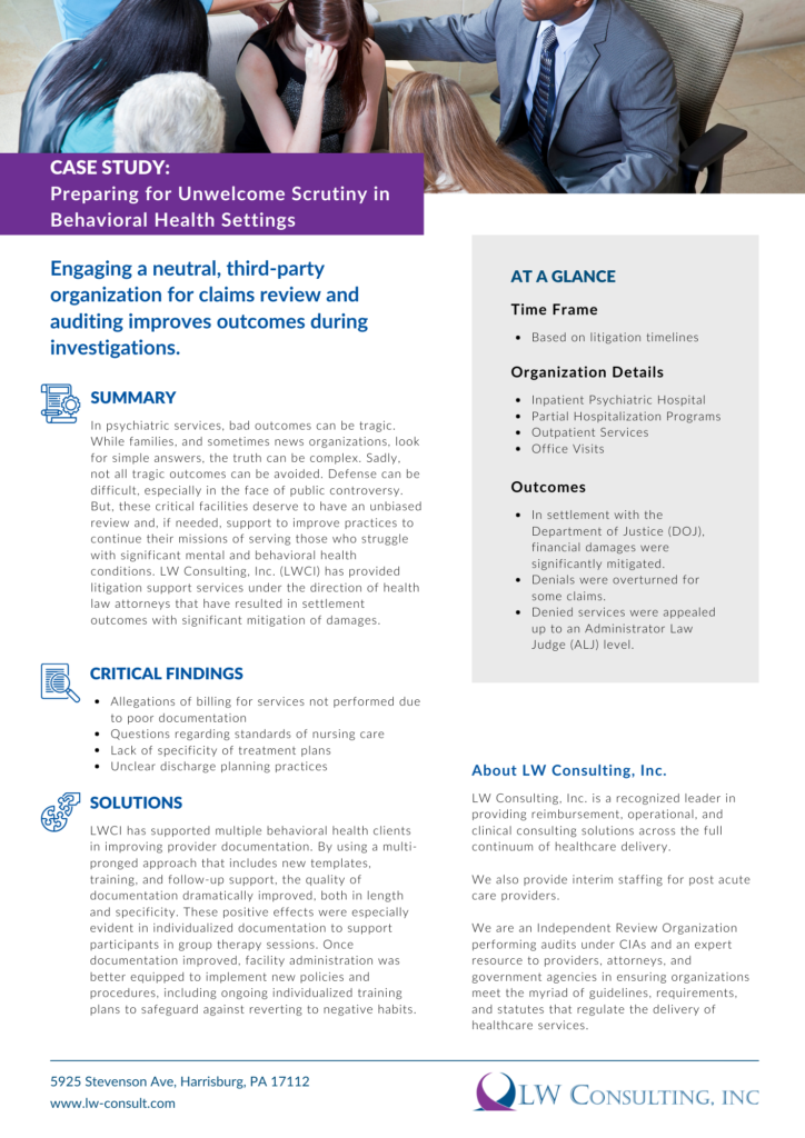 Whether you are considering acquisition, divestiture, or simply challenged by the CMS regulations governing medical necessity, restrictive admissions, and average length of stay criteria, LWCI is a single source to meet your needs.